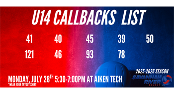 U14's Monday, July 28th 5:30-7:00PM at Aiken Tech *wear your tryout shirt 41 121 40 46 45 93 39 78 50