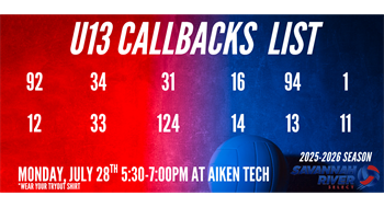 U13's Monday, July 28th 5:30-7:00PM at Aiken Tech *wear your tryout shirt 92 12 34 33 31 124 16 14 94 13 1 11